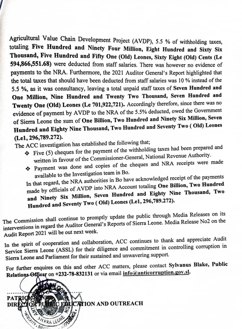 4.AGRICULTURAL VALUE CHAIN DEVELOPMENT PROJECT (AVDP)-BO. The Auditor General’s Report of 2021 revealed that, on the payroll documents of the Agricultural Value Chain Development Project (AVDP), 5.5 % of withholding taxes, totaling Five Hundred and Ninety Four Million, Eight Hundred and Sixty Six Thousand, Five Hundred and Fifty One (Old) Leones, Sixty Eight (Old) Cents (Le 594,866,551.68) were deducted from staff salaries. There was however no evidence of payments to the NRA. Furthermore, the 2021 Auditor General‘s Report highlighted that the total taxes that should have been deducted from staff salaries was 10 % instead of the 5.5 %, as it was consultancy, leaving a total unpaid staff taxes of Seven Hundred and One Million, Nine Hundred and Twenty Two Thousand, Seven Hundred and Twenty One (Old) Leones (Le 701,922,721). Accordingly therefore, since there was no evidence of payment by AVDP to the NRA of the 5.5% deducted, owed the Government of Sierra Leone the sum of One Billion, Two Hundred and Ninety Six Million, Seven Hundred and Eighty Nine Thousand, Two Hundred and Seventy Two ( Old) Leones (Le1, 296,789.272).