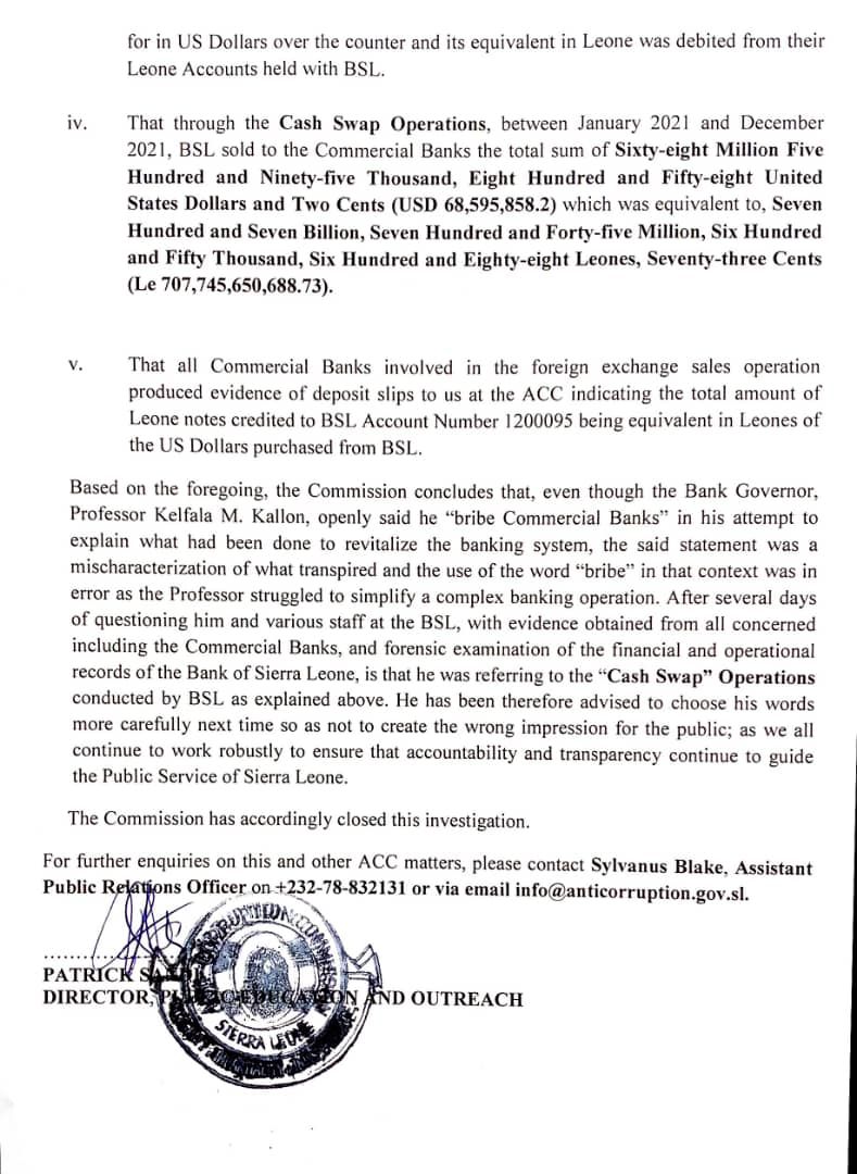 The Anti-Corruption Commission (ACC) wishes to inform the general public that it has concluded investigation of the Governor of the Bank of Sierra Leone (BSL), Professor Kelfala Morana Kallon over remarks he made at a pre-legislation presentation to Parliament on the 22nd November, 2021, in which he said, he “bribed” people who were hoarding the Leone to bring it back into the banking system in the total sum of Sixty-eight Million US Dollars (USD$ 68,000,000).